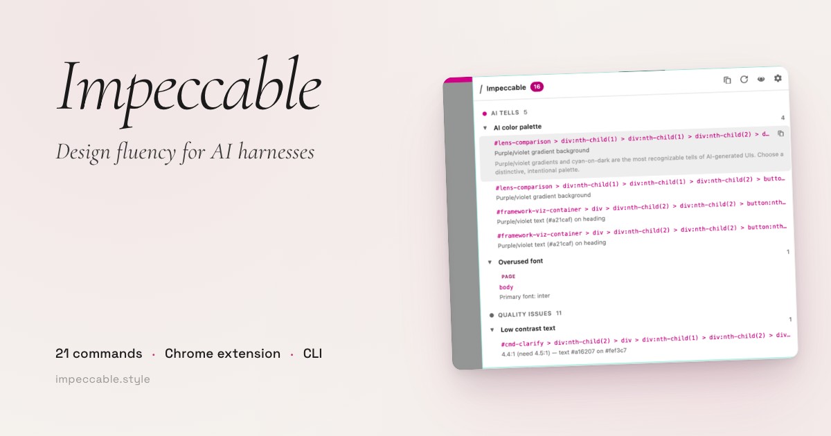 Design fluency for AI harnesses — a skill + 18 commands that steer AI toward better design and away from common UI anti-patterns.